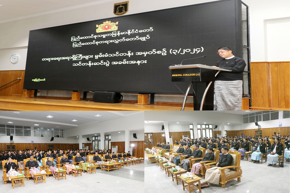 တရားရေးအရာရှိကြီးများမွမ်းမံသင်တန်း အမှတ်စဉ် (၃/၂၀၂၄) သင်တန်းဆင်းပွဲ အခမ်းအနားကို ယနေ့နံနက် ( ၉ : ၀၀ ) နာရီတွင် ပြည်ထောင်စုတရားလွှတ်တော်ချုပ်၊ Judicial College ၌ ကျင်းပပြုလုပ်ရာ ပြည်ထောင်စုတရားသူကြီးချုပ် ဦးသာဌေး တက်ရောက်၍ သင်တန်းဆင်းအမှာစကား ပြောကြားခဲ့ပါ သည်။