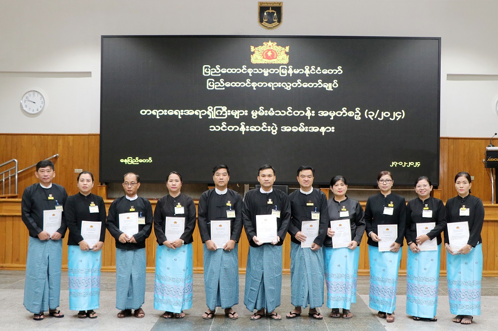 သင်တန်းဆင်းပွဲသို့ ပြည်ထောင်စုတရားသူကြီးချုပ်နှင့် ပြည်ထောင်စုတရားလွှတ်တော်ချုပ်တရားသူကြီးများ၊ အမြဲတမ်းအတွင်းဝန်၊ ညွှန်ကြားရေးမှူးချုပ်များ၊ ဒုတိယအမြဲတမ်းအတွင်းဝန်၊ ဒုတိယညွှန်ကြားရေးမှူးချုပ်များ၊ လက်ထောက်အတွင်းဝန်၊ ညွှန်ကြားရေးမှူးများနှင့် သင်တန်းသားများ တက်ရောက်ခဲ့ကြပါသည်။ သင်တန်းကာလ မှာ ၃၁-၁၀-၂၀၂၄ ရက်နေ့မှ ၂၇-၁၂-၂၀၂၄ ရက်နေ့အထိ ရက်သတ္တပတ် (၉) ပတ်ကြာမြင့် ကြောင်းနှင့် သင်တန်းသို့ ဒုတိယညွှန်ကြားရေးမှူး၊ ခရိုင်တရားသူကြီးနှင့် တွဲဖက်ခရိုင် တရားသူကြီးအဆင့်ရှိ သင်တန်းသား (၁၁) ဦး တက်ရောက်ခဲ့ကြကြောင်း သတင်းရရှိပါသည်။