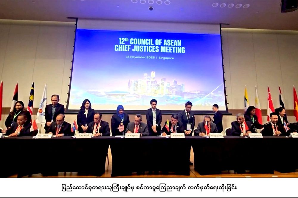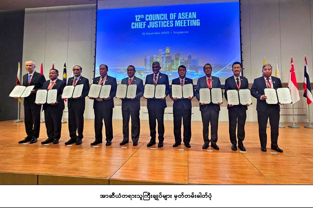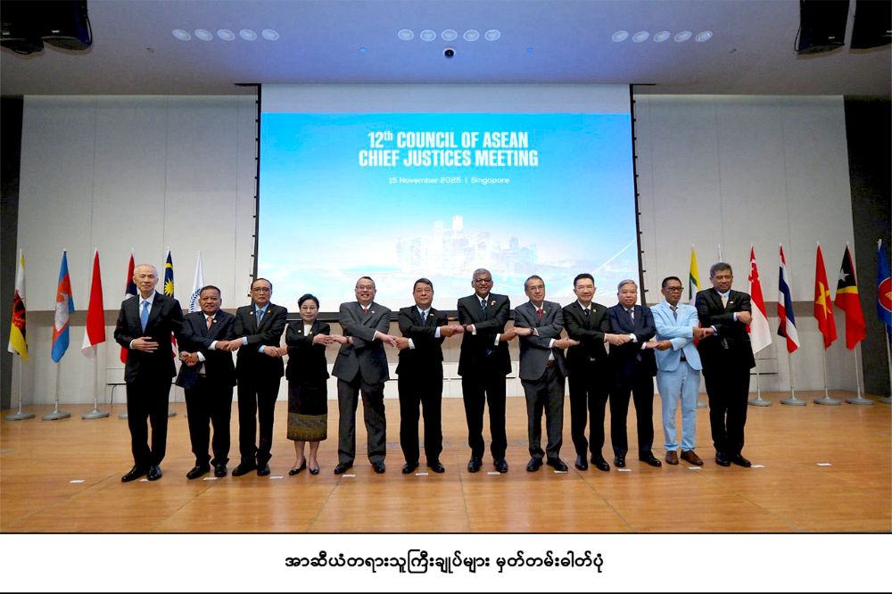 ပြည်ထောင်စုတရားသူကြီးတရားသူကြီးချုပ် ဦးဆောင်သော မြန်မာကိုယ်စားလှယ်အဖွဲ့သည် ၂၀၂၅ ခုနှစ် နိုဝင်ဘာလ ၁၅ ရက်နေ့တွင် စင်ကာပူနိုင်ငံ၊ တရားရုံးချုပ်တွင် ကျင်းပပြုလုပ်သည့် (၁၂) ကြိမ်မြောက် အာဆီယံတရားသူကြီးချုပ်များကောင်စီ အစည်းအဝေးသို့ တက်ရောက်သည်။ အစည်းအဝေးတွင် ပြည်ထောင်စုတရားသူကြီးချုပ် ဦးသာဌေးက အခြားအာဆီယံတရားသူကြီးချုပ်များ၊ ကိုယ်စားလှယ်အဖွဲ့ခေါင်းဆောင်များ၊ အာဆီယံဒုတိယအတွင်းရေးမှူးချုပ်တို့နှင့်အတူ အဖွင့်အမှာစကားပြောကြားသည်။ ထို့နောက် အာဆီယံတရားသူကြီးချုပ်များကောင်စီ၏ အာဆီယံတရားရေးပေါ်တယ် (ASEAN Judiciaries Portal) လုပ်ငန်းအဖွဲ့၊ တရားမမှုခင်းများဆိုင်ရာ (Civil Proceedings) လုပ်ငန်းအဖွဲ့၊ မှုခင်းစီမံခန့်ခွဲမှုနှင့် တရားရုံးနည်းပညာဆိုင်ရာ (Case Management and Court Technology) လုပ်ငန်းအဖွဲ့ ၊ တရားစီရင်ရေးဆိုင်ရာ လေ့ကျင့်ရေးနှင့် သင်ကြားရေးဆိုင်ရာ (Judicial Training and Education) လုပ်ငန်းအဖွဲ့၊ နိုင်ငံဖြတ်ကျော်ဖြစ်ပွားသည့် မိသားစုမှုခင်းဆိုင်ရာ ကလေးသူငယ် အငြင်းပွားမှုများဖြေရှင်းရေး (Cross-Border Disputes Involving Children) လုပ်ငန်း အဖွဲ့၊ ဗီဒီယိုကွန်ဖရင့်ဖြင့် အမှုကြားနာစစ်ဆေးခြင်းဆိုင်ရာ (Conduct of Video Conferencing Hearings) လုပ်ငန်းအဖွဲ့၊ အာဆီယံနှင့် အခြားမိတ်ဖက်နိုင်ငံများ တွေ့ဆုံဆွေးနွေးမှုပြုခြင်းဆိုင်ရာ (ASEAN + Meetings) လုပ်ငန်းအဖွဲ့နှင့် ရာသီဥတုဆိုင်ရာ တရားမျှတမှု (Climate Justice) လုပ်ငန်းအဖွဲ့တို့က ဆောင်ရွက်ပြီးလုပ်ငန်းများ၊ ရရှိသည့် အောင်မြင်မှုများနှင့် ဆက်လက်ဆောင်ရွက်မည့် အဆိုပြုချက်များနှင့်စပ်လျဉ်းသည့် အစီရင်ခံစာများကို အာဆီယံတရားသူကြီးချုပ်များကောင်စီသို့ တင်ပြအတည်ပြုချက် ရယူကြသည်။ အစည်းအဝေးတွင် ပြည်ထောင်စုတရားသူကြီးချုပ် ဦးသာဌေးက မြန်မာနိုင်ငံတရားစီရင်ရေးနှင့်သက်ဆိုင်သည့် အကြောင်းအရာများအား ပါဝင်ဆွေးနွေးခဲ့သည်။