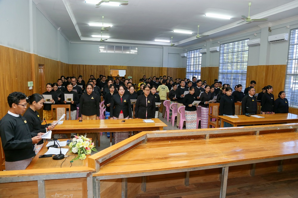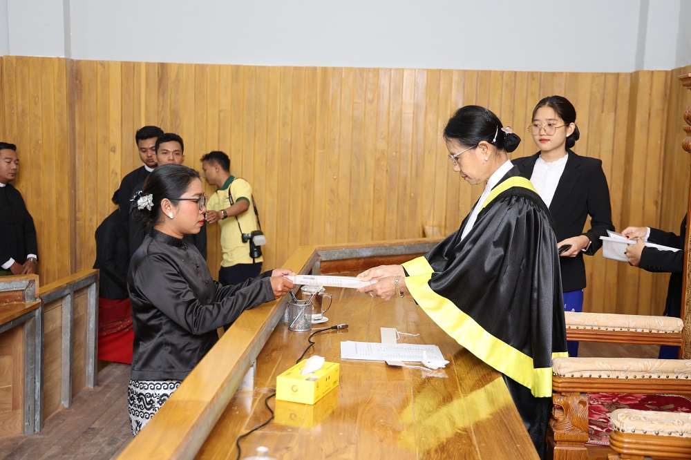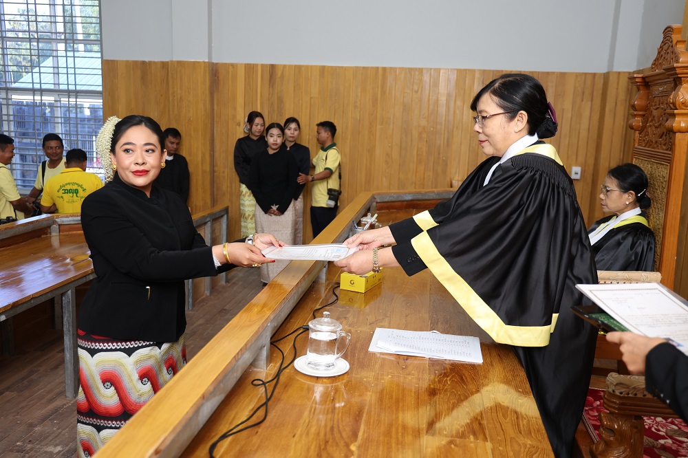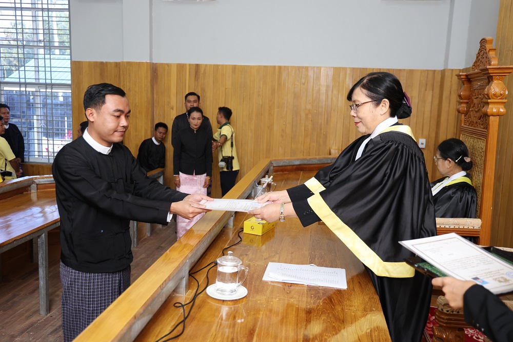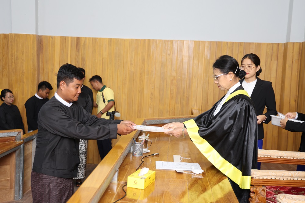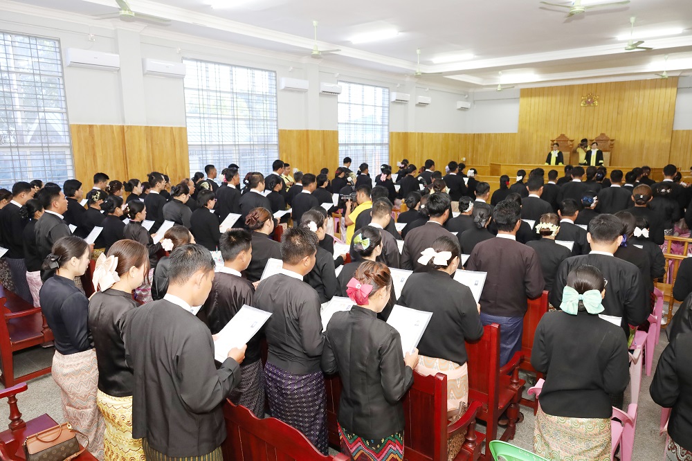 ဇေယျာသီရိခရိုင်တရားရုံး၊ ရုံးခန်းအမှတ် (၂) တွင် တရားလွှတ်တော်ရှေ့နေ အသိအမှတ်ပြု လက်မှတ်ပေးအပ်သည့် အခမ်းအနားကို ယနေ့နံနက် (၈:၀၀) အချိန်တွင်ကျင်းပသည်။ အဆိုပါ အခမ်းအနားသို့ ပြည်ထောင်စုတရားလွှတ်တော်ချုပ်တရားသူကြီး ဒေါ်သင်းသင်းနွဲ့နှင့် ဒေါ်သင်းသင်းချိုတို့ တက်ရောက်ကြပြီး ပြည်ထောင်စုတရားလွှတ်တော်ချုပ်တရားသူကြီး ဒေါ်သင်းသင်းနွဲ့က အမှာစကားပြောကြားသည်။ အခမ်းအနားတက်ရောက်လာသည့် အထက်တန်းရှေ့နေ (၁၁၁) ဦးတို့အား တရားလွှတ်တော်ရှေ့နေအသိအမှတ်ပြုလက်မှတ်များ ပေးအပ်ပြီးနောက် တရားလွှတ်တော်ရှေ့နေအသိအမှတ်ပြု လက်မှတ်ရရှိသူများက ကတိသစ္စာပြုကြသည်။ အခမ်းအနားသို့ ပြည်ထောင်စုတရားစီရင်ရေးကြီးကြပ်မှုရုံးမှ တာဝန်ရှိသူများ တက်ရောက်ကြသည်။